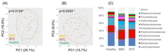 Overview of the fecal microbiota in patients with BTC, patients with BBD and healthy subjects. (A) Weighted and (B) unweighted UniFrac PCoA of the fecal microbiota; (C) Composition of the fecal microbiota at the family level. * p < 0.05.