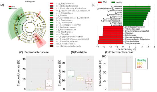 Characteristics of the fecal microbiota in each group. (A) Cladogram and (B) LDA score based on LEfSe of the fecal microbiota composition of (C) Enterobacteriaceae and (D) Clostridia. (E) OTUs assigned to Enterobacteriaceae between the bile samples from the BBD and BTC groups. The LDA scores and compositions of Enterobacteriaceae are shown.