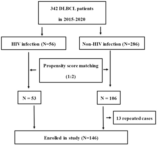 Between January 2015 and December 2020, 342 (56 HIV-infected and 286 HIV-uninfected) DBBCL patients from the First Affiliated Hospital, College of Medicine, Zhejiang University, China, were eligible for enrollment in this retrospective study. Patients were excluded if they had liver cirrhosis, congestive heart failure, chronic kidney disorders, chronic obstructive pulmonary disease (COPD), solid organ malignancies or NHL relapse. DLBCL was diagnosed by pathological biopsy based on the 2016 revision of the World Health Organization classification of lymphoid neoplasms [22]. Propensity score matching for age, sex, BMI and IPI was used to select patients according to a ratio of 1:2 at a matching tolerance of 0.2. After 13 repeated cases were excluded, 53 HIV-infected and 93 HIV-uninfected patients were enrolled in the present study. The flowchart of patient selection is shown in Figure 1. Basic medical information of patients and chemotherapy regimens were recorded in the electronic medical records system (EMRS) of the hospital. Cases were followed up to December 2021 by clinical record, medical visiting and telephone interview.