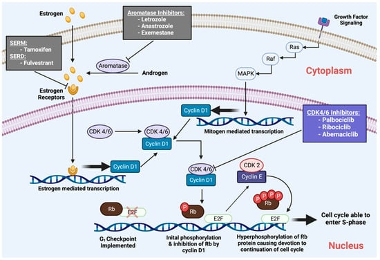 Anti-estrogen treatments include aromatase inhibitors, such as letrozole, and estrogen receptor antagonists, such as fulvestrant. However, a consequence of these long-term therapies is acquired resistance. Therefore, additional agents are required to attenuate the mechanisms of resistance and its associated rise in breast cancer mortality rates. To prevent therapeutic resistance, long-term therapies for breast malignancies must be consistent, stable, and, most importantly, selective to the target cancer cells [23]. The specificity of the CDK4/6Is, and evidence for increased CDK activity in HR+ breast cancers suggested the potential utility of CDK4/6Is in combination with endocrine therapy for therapy-specific breast cancer subtypes [24,25] (Figure 1).