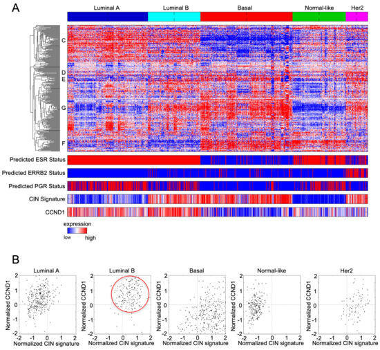 Chromosomal instability signature and cyclin D1 expression in breast cancer subtypes. (A) Heatmap of breast cancer microarray datasets assigned to the breast cancer coding genome expression subtypes. The predicted ESR1, epidermal growth factor receptor (ERBB2), and progesterone receptor (PGR) statuses are shown together with a chromosomal instability gene signature (CIN) signature score and CCND1 expression level across the 5 subtypes. The CIN signature score, and cyclin D1 expression level are outlined for the luminal B subtype. (B) CCND1 transcript level plotted vs. CIN signature expression level show a correlation between high CIN score and high cyclin D1 expression in luminal B subtype specific (red circle).