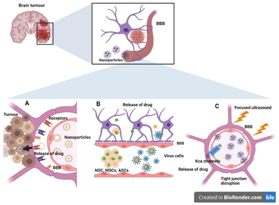 Smart nanoengineering approaches to circumvent the blood brain barrier (BBB). (A) Transcellular and paracellular transport pathways. Increased expression of receptors such as transferrin, integrins and LDL receptors facilitate the receptor-mediated uptake of drug-carrying nanoformulations. (B) Cell- and viral-mediated BBB crossing. Various stem cells, neutrophils, and viral vectors can cross the BBB carrying nanomedicine. (C) Physico-chemical (transient) disruption of the BBB. Focused ultrasound can decrease the structural proteins of tight junctions, namely, claudins and occludin. It can also increase the expression of calcium-activated channels for the delivery of nanomedicine. (ASCs: Adipose-derived mesenchymal stem cells; BBB: Blood brain barrier; BM-MSCs: Bone marrow-derived mesenchymal stem cells; LDL: Low-density lipoprotein; MSCs: Mesenchyma stem cells; NSCs: Neural stem cells; KCa: Calcium-activated potassium channels).