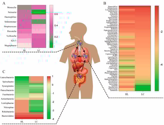 The bacteria composition of the airway, lung, and gut in healthy (HL) and lung cancer (LC) individuals. (A) The airway bacteria composition of the top ten taxa at the genus level. (B) The composition of lung bacteria at the genus level. (C) The gut bacteria composition of the main taxa at the phylum level. The oral bacteria may be the primary source of lung bacteria due to a long-term and dynamic circulation (through mucosal dispersion, swallowing, and micro-aerosols or secretions generated in oral cavities).