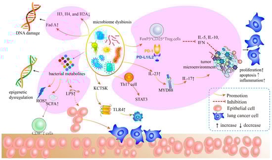 Microbiome dysregulation, which is characterized by altered bacterial composition, abundance, and diversity, has been linked to an increased host susceptibility to pathogenic infections, a worsening of intestinal inflammation and autoimmunity, the onset of metabolic disorders, and the promotion of the development of neurological diseases [19]. In contrast, dysbiosis of the microbiome leads to a decrease in commensal microorganisms and an increase in inflammation-causing bacteria, which can drive carcinogenesis at multiple levels. Notably, carcinogenesis of lung cancer is thought to be the result of dysbiosis rather than specific pathogen activity [13]. Dysbiosis has been linked to an increase in genotoxins and metabolites related to mutagenesis and carcinogenesis, as well as a dysregulation of the immune system [82]. For example, in an experiment in which mice with different gut bacteria compositions were irradiated, dysbiosis had a greater impact on host cell tolerance to DNA-damaging agents [83]. Gui et al. [46] observed dysbiosis of butyrate-producing gut bacteria in people with non-small-cell lung cancer. Moreover, butyrate directly enhances the antitumor cytotoxic effect of mouse CD8+ T lymphocytes in vivo and in vitro by boosting the IL-12 signaling pathway in an ID2-dependent manner. Hence, it is important to maintain the balance of the bacteria colonized in the lung to promote the stability of the tumor microenvironment and normal lung tissue.