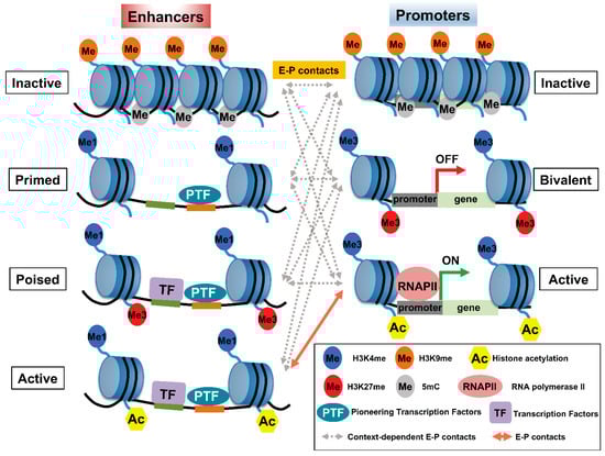 Histone modification is widely used as a means to classify enhancers according to their activity: H3K4me1 and the binding of trithorax-related mixed lineage leukemia (MLL) complex define primed or active enhancers; H3K27me3 is a key marker of poised or inactive enhancers; histone H3 lysine 27 acetylation (H3K27ac) is a hallmark of transcriptionally active enhancers (Figure 1) [,,,]. Recent trends highlight that rather than defining active enhancers with H3K27ac, different histone acetylation marks, such as simultaneous acetylation of histone H4 at both K5 and K8 (H4K5acK8ac) [], Das et al., [submitted], histone H2B N-terminus multisite lysine (e.g., K5, K12, K16, and K20) acetylation (H2BNTac []), H3K122ac [], and H4K16ac [], to define active enhancers are emerging. A large number of histone modifications have been implicated in gene transcription, where H3K4me3 has been associated with gene promoter regions []. Table 1 summarizes the most well-characterized histone modifications and their involvement in E–P interactions.
