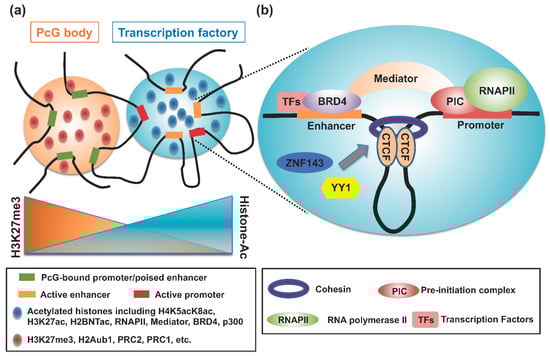 Along with CTCF and cohesin, post-translational modification of histones is necessary to determine the 3D structural organization of chromatin (Figure 3). The enrichment of particular histone marks in various regions of chromatin is associated with their compartmentalization, where active and inactive histone marks, respectively, define the A and B compartments of chromatin [,]. The allocation of chromatin into its A and B compartments is independent of CTCF and cohesin [,]. In human cancer cells, histone hyperacetylation driven by a fusion oncoprotein (BRD4-NUT) facilitates the formation of a newly recognized chromatin interaction with a unique sub-compartment [].