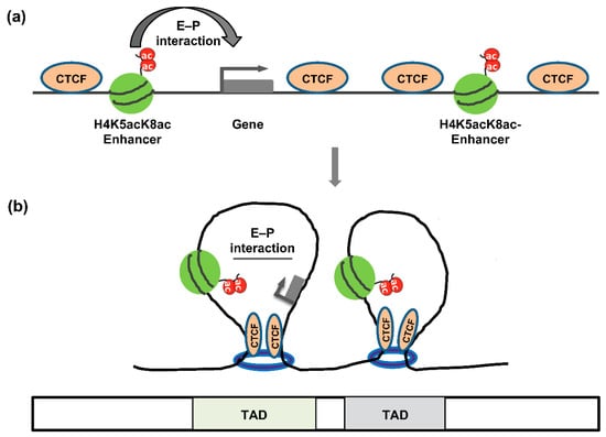 Schematic of E–P interaction and TAD into genome organization. (a) A hypothetical E–P interaction. An enhancer enriched with histone modification, (i.e., H4K5acK8ac) drives the expression of the associated gene by forming the E–P interaction. CTCF enrichments are shown that mediate the formation of TAD (b) TADs form the genome organization. An E–P interaction occurs within the TAD, and regions within the TAD are more likely to interact each other than regions outside the TAD. Cohesin is indicated by blue rings.