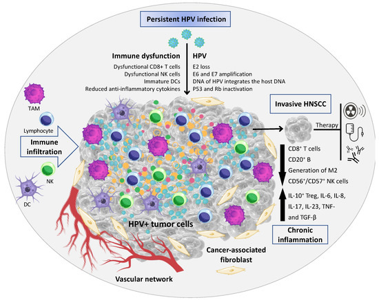 - Lechien, J.R.; Descamps, G.; Seminerio, I.; Furgiuele, S.; Dequanter, D.; Mouawad, F.; Badoual, C.; Journe, F.; Saussez, S. HPV involvement in the tumor microenvironment and immune treatment in head and neck squamous cell carcinomas. Cancers 2020, 12, 1060. [Google Scholar] [CrossRef]