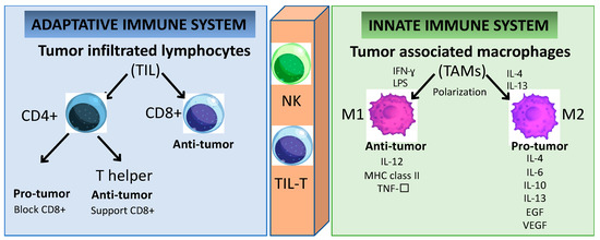 | Inflammatory cell subsets | NCT00210470 | Completed | IRX-2 (multiple cytokines) Cyclophosphamide Indomethacin Zinc Omeprazole | 2 | 27 | 2005/07–2012/03 | https://ClinicalTrials.gov/show/NCT00210470 (accessed on 28 September 2022) | [126,127,128,129] | n.d. ** | Increased infiltration of TILs (CD3+, CD4+, CD8+ and CD20+ B cells) and CD68+ macrophages in tumor microenvironment. Peritumoral accumulation of CD4+ T cells. Predominance of intratumor CD8+ over CD4+ T cells. Higher CD20+ cells were associated with decreased tumor size. Increased survival rates associated with intratumor CD3+ and CD20+ cells. | Decreased levels of naïve T cells (CD3+CD45RA+CCR7+), central memory T cells (CD3+CD45RA−CCR7+CD27+), B lymphocytes (CD19+CD3−CD14−) and NKT cells (CD3+CD16+CD56+). |
