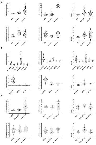 Next, we analyzed mRNA levels of IL6, IL8, and VEGF together with established markers of cell senescence CDKN2A and LMNB1, in MAT-MSCs. CDKN2A encodes p16INK4a, a protein elevated in cultured senescent cells, while LMNB1 encodes lamin B1, whose reduction is considered a senescence-associated biomarker [32,33]. As shown in Figure 2a, we found a 3.2- and 2.3-fold increase in IL6 and VEGF—while not of IL8—mRNA levels in MAT-MSCs co-cultured with MCF7 (Figure 2a; adjp < 0.05) compared to control cells, represented by MAT-MSCs monocultures. Furthermore, we observed that co-cultures with MDA-MB231 induced IL6, IL8 and VEGF mRNAs in MAT-MSCs by 5.9-, 36.3- and 2.4-fold, respectively (Figure 2a; adjp < 0.001). Of note, co-cultures with MCF7, while not with MDA-MB231, modified the expression levels of CDKN2A (3-fold increase) and LMNB1 (about 50% reduction) in MAT-MSCs (Figure 2a; adjp < 0.05). Then, we measured mRNA levels of ACTA2, encoding α-SMA, a marker of myofibroblast trans-differentiation, and observed that both MCF7 and MDA-MB231 promoted its expression in MAT-MSCs by 2- and 3-fold, respectively (Figure 2a; adjp < 0.01). No correlation between gene expression profiles and antropometric and biochemical data of the donors was found in MAT-MSCs.