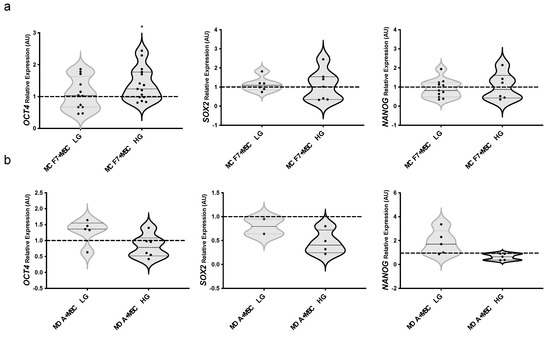 Effect of glucose on BC cells stemness in 2D cultures with MAT-MSCs. (a) MCF7 or (b) MDA-MB231 were co-cultured-and not—with MAT-MSCs in low glucose (5.5 mM; LG) or standard/high glucose (25 mM; HG) medium. After 72 h, mRNA expression levels of stemness genes (OCT4, SOX2, NANOG) were determined by qPCR (see Methods and Supplementary Table S1). Data were normalized on PPIA gene as internal standard. Results were represented as violin plot of 7–15 independent triplicate experiments showing mRNA levels of OCT4, SOX2 and NANOG in (a) MCF7 + MSC LG/HG and (b) MDA-MB231 + MSC LG/HG as relative expression (2−ΔΔCt) compared to that in monocultured cells (MCF7/MDA-MB231 LG/HG; dotted line). Data were analyzed using the non-parametric Wilcoxon test for pairwise comparisons. * denotes statistically significant values (* pval < 0.05).