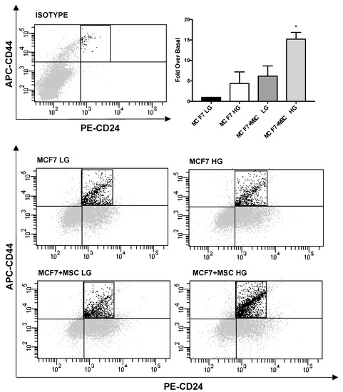 Quantification of CD44high/CD24low subpopulation in BC cells co-cultured with MAT-MSCs. MCF7 were co-cultured—and not—with MAT-MSCs in LG or HG medium. After 72 h, CD44high/CD24low stem cell subpopulation was identified in monocultured (MCF7 LG/HG) and co-cultured (MCF7 + MSC LG/HG) MCF7 by FACS analysis (See Section 2). Representative dot plots show MCF7 stained with APC-anti-CD44 and PE-anti-CD24 as well as dye/isotype matched antibodies. In the graph, the percentage of population was reported as fold over basal (MCF7 LG) and showed CD44high/CD24low cell subpopulation as mean ± SD of 4 independent experiments. Data were analyzed using the non-parametric Friedman test followed by Dunn’s correction for multiple comparisons. * denotes statistically significant values compared with MCF7 LG (* adjp < 0.01).
