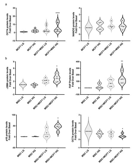 Notably, when disaggregated, MCF7 included in spheroids with MAT-MSCs in HG displayed a 4.3-fold increase in OCT44 protein (adjp < 0.05) with no change of NANOG levels (Figure 7a, Supplementary Figure S7a). In parallel, in the same spheroids, a significant increase in α-SMA (adjp < 0.05), FAP (adjp < 0.01) and p16INK4a (adjp < 0.05) proteins was observed in MAT-MSCs (Figure 7b, Supplementary Figure S7b). In addition, in these cells NANOG protein levels did not change. However, a 50% significant reduction of OCT4 (adjp < 0.05) was detected (Figure 7b, Supplementary Figure S7b).