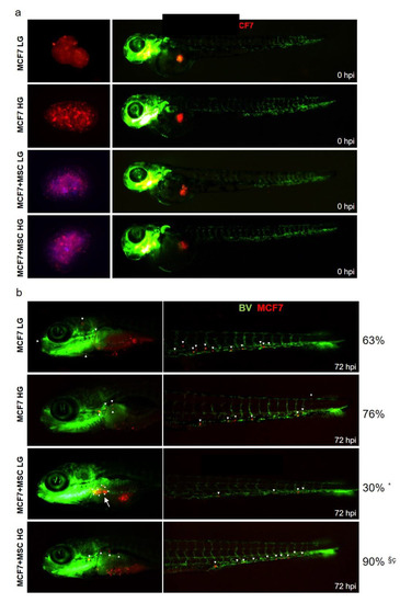Finally, spheroid-derived cells were engrafted in 2-day-old zebrafish embryos (Figure 8a). Immediately after injection, cells were localized in the yolk sac (Figure 8a, red spot). At 72 h post-injection, cells were able to migrate in head and tail regions (Figure 8b, white arrows). Monocultured MCF7 in LG and HG showed a similar dissemination rate. Indeed, 63% of xenografts with invasive MCF7 in LG, and 76% with invasive cells in HG were detected (Figure 8b). Interestingly, when injected MCF7+MSCs in LG, only 30% of xenografts displayed invasive BC cells, a percentage significantly reduced as compared to xenografts with MCF7 monocultures. In this condition, the majority of zebrafish displayed a clear localized tumor mass (Figure 8b, bigger white arrow). At variance, when injected, MCF7 + MSCs in HG 90% of xenografts showed invasive cells, a percentage significantly higher compared to xenografts with MCF7 monocultures or MCF7 + MSCs in LG (Figure 8b).