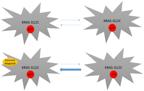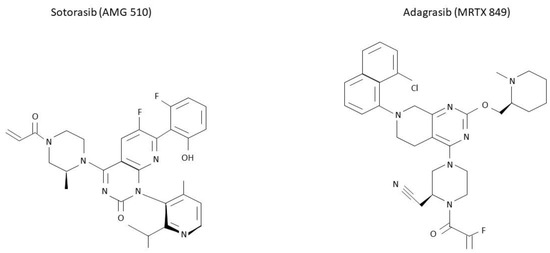 As mentioned above, KRAS mutations have been considered undruggable for many years. Difficulties in targeting this protein were mainly linked to its smooth surface coupled with its high affinity to GTP, which made the targeting of the GDP/GTP binding site very challenging [29]. The subsequent discovery of the switch pocket II of KRAS protein represented a breakthrough in the treatment of KRAS mutations and molecules that specifically bind cysteine residues of KRAS mutant proteins were further developed. Because this binding preferentially occurs in the RAS-GDP form, KRAS G12C inhibitors mainly act by trapping KRAS-GDP proteins and consequently by impairing their transition to the KRAS-GTP active state [29,57,58,59] (Figure 2). Even though different molecules have been developed to date, sotorasib and adagrasib are the two having received regulatory approval to date (Figure 3).