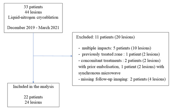 Between December 2019 and March 2021, 33 patients underwent percutaneous cryoablation at our institute. Among them, 11 patients (20 lesions) were not included in the study for the following reasons: multiple impact (5 patients), cryoablation of previously treated zone (1 patient), concomitant treatment (3 patients), and missing imaging data (2 patients) (Figure 1). Finally, 22 consecutive patients (24 lesions) were included in the study. The patients were 16 men (73%) and 6 women (27%), and median age was 66 years (range: 36–89). The lesions were located in the bone (42%), kidney (29%), soft tissue (17%), including lymph nodes, lung (8%), and the liver (4%) (Table 1). The median tumor size was 20.5 mm (major axis) (range: 5–38) and 17 mm (minor axis) (range: 5–36) (Table 2).