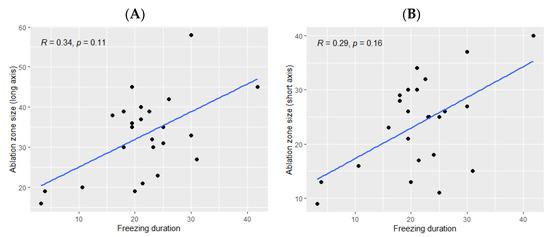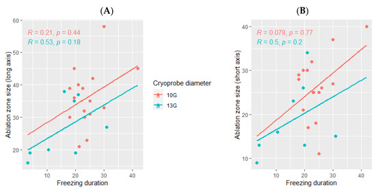 Correlation between the size of the ablation zone and the total freezing duration; (A): major axis; (B): minor axis. The correlations are represented by the Spearman coefficient (R). A coefficient close to 1 shows a strong positive correlation, while a coefficient close to −1 shows a strong negative correlation. The p-value (p) indicates the significance level of the observed correlation.
