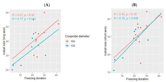 Correlation between the ice ball size and the total freezing duration; (A): major axis; (B): minor axis. The correlations are represented with Spearman coefficient (R). A coefficient close to 1 shows a strong positive correlation, while a coefficient close to −1 shows a strong negative correlation. The p-value (p) indicates the significance level of the observed correlation.