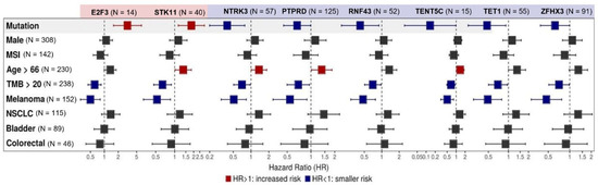 Multivariate analysis of individual gene alterations in high TMB patients. Forest plot for overall survival (OS) in multivariate analysis. Adjustment variables included TMB under or above the median of 20 mut/Mb, sex, median age, microsatellite instability (MSI) status, and tumor types (non-small cell lung cancer (NSCLC), melanoma, bladder cancer, and colorectal cancer). Mutations in STK11 (N = 40, HR 1.84 (95% CI, 1.14 - 2.97) and E2F3 (N = 14, HR 3.17 (95% CI, 1.58–6.38]) were related to worse survival (p < 0.05), while mutations in NTRK (N = 57, HR 0.39 95% CI, 0.20–0.78), PTPRD (N = 125, HR 0.67 95% CI, 0.45–0.99), RNF43 (N = 52, HR 0.42 95% CI, 0.2015–0.89), TENT5C (N = 15, HR 0.14 95% CI, 0.02–0.98), TET1 (N = 55, HR 0.48 95% CI, 0.25–0.91), and ZFHX3 (N= 91, HR 0.62 95% CI, 0.39–0.99) were associated with better OS. Melanoma histology and TMB above the median TMB of the cohort (20 mut/Mb) endowed patients with better OS (p < 0.05). MSI status, age, and gender did not have a consistent statistically significant effect on OS.
