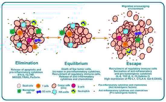 The second phase is the equilibrium phase. As the name suggests, it creates a microenvironment that contains a balance of pro-inflammatory cytokines and anti-inflammatory cytokines [36]. This phase of immunoediting results in dormancy of tumor growth. Nothing happens in this phase; the tumor is not eradicated, but it also does not grow. This phase is poorly understood, but it is known that the immune system keeps the tumor in a state of functional dormancy in this phase [36].