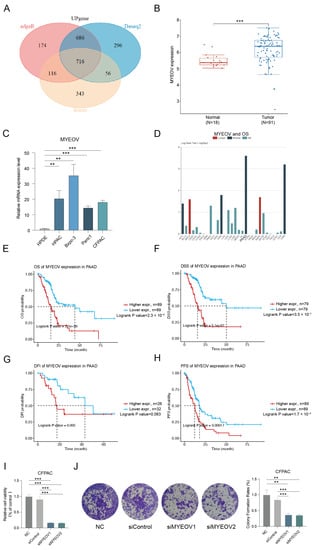 MYEOV was found to be a key upregulated gene associated with pancreatic cancer. (A) Intersection was performed to obtain the upregulated genes simultaneously analyzed by three methods. (B) Results of differential gene expression analysis combined by GSE107610 and GSE16515 datasets from the GEO database. T, tumor tissue; N, normal tissue. (C) Relative mRNA levels of MYEOV in HPDE and some pancreatic cancer cells (HPAC, Bxpc-3, Panc1, CFPAC). N = 3. ** p < 0.01, *** p < 0.001. (D) MYEOV was linked to shorter OS in pancreatic cancer. PAAD, pancreatic adenocarcinoma. (E) OS curves of MYEOV expression in PAAD. (F) DSS curves of MYEOV expression in PAAD. (G) DFI curves of MYEOV expression in PAAD. (H) PFS curves of MYEOV expression in PAAD. (I) Relative cell viability changes of CFPAC cells after knockdown of MYEOV with siRNAs. (J) Relative colony formation rate changes of CFPAC cells after knockdown of MYEOV with siRNAs.