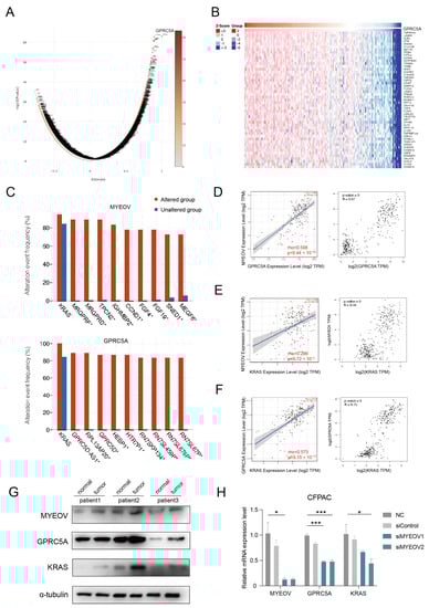 Gene co-expression analysis of MYEOV in pancreatic cancer. (A) Volcano map of genes obtained from MYEOV co-expression analysis. (B) Heat map of positively correlated genes from MYEOV co-expression analysis. (C) Alteration-associated gene predictions for MYEOV and GPRC5A, respectively, by the cBioPortal database. (D) There was a strong positive association between MYEOV and GPRC5A. (E) There was a strong positive association between MYEOV and KRAS. (F) There was a significant positive association between GPRC5A and KRAS. (G) Protein expression levels of MYEOV, GPRC5A, and KRAS in pancreatic cancer tissues and normal tissues adjacent to pancreatic cancer from three pancreatic cancer patients were detected by western blotting. (H) Changes in mRNA levels of MYEOV, GPRC5A, and KRAS after knockdown of MYEOV with siRNAs in CFPAC cells. * p < 0.05, *** p < 0.001.