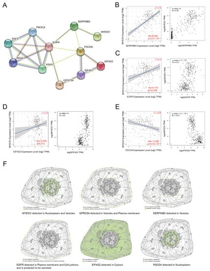 PPI analysis and molecular regulatory network of MYEOV. (A) MYEOV, GPRC5A, and KRAS had protein interactions with genes such as SERPINB5, EGFR, EIF4G2, and PDCD4. The light green lines indicate text mining, the black lines indicate co-expression, the purple lines indicate their relationship was experimentally determined, and the blue lines indicate their relationship was from curated databases. (B) MYEOV was significantly associated with SERPINB5 by the analysis of the Timer2 database and the GEPIA database. (C) MYEOV was significantly associated with EGFR by the analysis of the Timer2 database and the GEPIA database. (D) MYEOV was significantly associated with EIF4G2 by the analysis of the Timer2 database and the GEPIA database. (E) MYEOV was significantly associated with PDCD4 by the analysis of the Timer2 database and the GEPIA database. (F) The subcellular localization of MYEOV, GPRC5A, SERPINB5, EGFR, EIF4G2, and PDCD4 proteins.