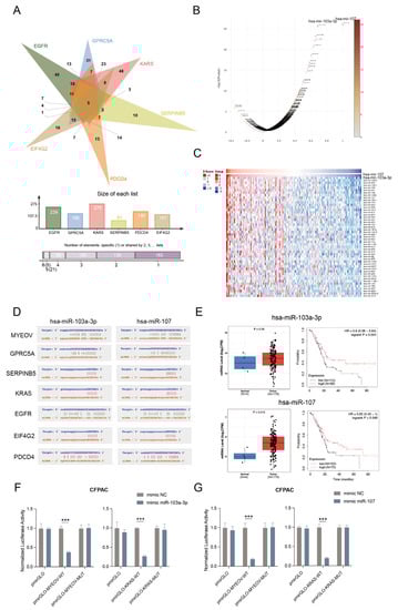 MYEOV acts as ceRNA for the regulation of multiple genes. (A) Intersections of miRNAs bound to GPRC5A, SERPINB5, KRAS, EGFR, EIF4G2, and PDCD4. (B) Volcano map of miRNAs correlated with hsa-miR-107. (C) Heat map of miRNAs positively correlated with hsa-miR-107. (D) The active sites of two miRNAs with MYEOV, GPRC5A, SERPINB5, KRAS, EGFR, EIF4G2, and PDCD4. (E) The expression analyses and survival curves of hsa-miR-103a-3p and hsa-miR-107. (F) Dual-luciferase reporter gene assays confirmed the binding specificity of MYEOV/KRAS and hsa-miR-103a-3p. (G) Dual-luciferase reporter gene assays confirmed the binding specificity of MYEOV/KRAS and hsa-miR-107. WT, wild type; MUT, mutation. *** p < 0.001.