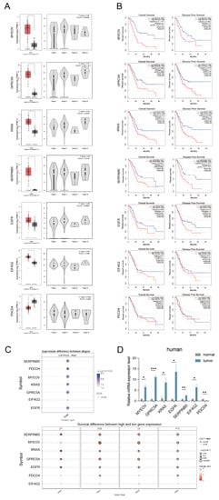 Differential expression analyses of relevant genes were validated using the GEO database (https://www.ncbi.nlm.nih.gov/geo/ (accessed on 30 April 2022)) and the GEPIA database (http://gepia.cancer-pku.cn/ (accessed on 30 April 2022)). Log2(TPM + 1) was used for the log scale. Analysis of differential gene expression was performed by data from the GTEx and TCGA portals. The correlation of MYEOV with tumor grade was analyzed by the TISIDB database (http://cis.hku.hk/TISIDB (accessed on 30 April 2022)). TISIDB is a database that integrates multiple heterogeneous data types, including but not restricted to TCGA.