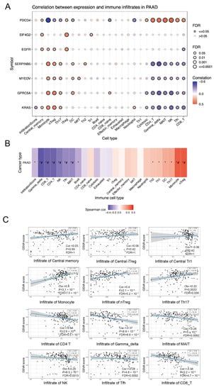 Immune infiltration analysis of genes associated with the MYEOV regulatory network. (A) Immune cell infiltration analyses of MYEOV, GPRC5A, SERPINB5, KRAS, EGFR, EIF4G2, and PDCD4 in pancreatic cancer. (B) Correlation analysis of infiltrated immune cells and pancreatic cancer. Positive correlation is in red and negative correlation is in blue. * p value ≤ 0.05; # FDR ≤ 0.05. (C) Dot maps of spearman correlation between GSVA score and infiltrated immune cells in PAAD.