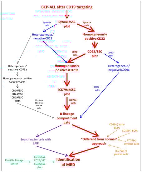 Multicolor flow cytometry (MFC) is a widely applicable technology for minimal residual disease (MRD) monitoring in patients with B-cell precursor acute lymphoblastic leukemia (BCP-ALL) [1,2]. MFC is relatively faster, less expensive and less laborious than methods used for the detection of fusion genes, their transcripts (FGTs) or patient-specific rearrangements of immunoglobulin and T-cell receptor genes (IG/TR), such as either real-time quantitative PCR (RQ-PCR) or next-generation sequencing (NGS) [2,3]. Moreover, MFC allows for the detailed analysis of bone marrow (BM) cell compartments, as well as of the immunophenotype of the residual leukemic population [3]. Last, it is crucial for the selection of targets for immunotherapy [3], which is now frequently applied for slow MRD responders or in patients with MRD reappearance [4,5]. The active use of immunotherapeutic drugs against CD19 (the bispecific T-cell engager blinatumomab and T cells with chimeric antigen receptors (CAR-T)) [6,7] significantly complicates MFC-MRD monitoring because of possible CD19 downregulation by tumor cells [8,9]. This possible CD19 negativity breaks well-established algorithms of MFC data interpretation [10], as CD19 is typically used for primary B-lineage gating with the subsequent analysis of the CD19-positive compartment [11,12]. Moreover, the selective pressure of the CD19-directed treatment increases the incidence of the so-called lineage switch [13,14], which has become one of the possible mechanisms of BCP-ALL resistance to immunotherapy. Therefore, it is necessary to modify the conventional MFC-MRD approach to overcome the mentioned problems.