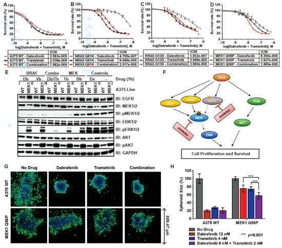 After assessing the MEK and BRAF inhibitor resistance phenotypes of A375 melanoma model cell lines in both 2D and 3D tissue culture, we next evaluated each line for sensitivity to combination MEK/BRAF inhibitor treatment. Each cell line was treated in 2D tissue culture with either the BRAF inhibitor dabrafenib, the MEK inhibitor trametinib, or an equivalent combination drug treatment consisting of a half-dose of dabrafenib and a half-dose of trametinib (Figure 5A–C). A375 WT cells were found to have a similar level of sensitivity to MEK, BRAF, and combination inhibitor treatment in 2D tissue culture (Figure 4A), while RAS and MEK mutant lines were more sensitive to trametinib than to dabrafenib at all drug concentrations tested (Figure 4B–D). However, while the sensitivity of NRAS Q61K and KRAS G13D cells to combination drug treatment was intermediate to the sensitivity to each drug in isolation (Figure 5B,C), MEK1 Q56P cells were more sensitive to a half-dose of dabrafenib in combination with a half-dose of trametinib than to a full dose of either drug alone, across a wide range of drug concentrations (Figure 5D).