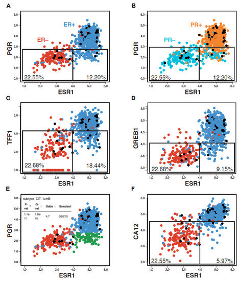 To examine whether the PR clinical status reflects ER expression and/or activity, we generated a pair-wise scatterplot representation of ESR1 and PGR expression levels in an RNA-seq breast tumor transcriptome dataset from the Cancer Genome Atlas (TCGA, 754 tumors) using MiSTIC, a visualization platform for gene–gene correlation studies and enrichment analysis [55]. This analysis revealed that, although PGR expression levels were well correlated with those of ESR1 (Pearson correlation 0.68), tumors with low PGR expression levels have a broad range of ESR1 expression levels. Indeed, selecting a PGR expression level cut-off leading to the exclusion of ~90% of ESR1low tumors (~22.5% of all tumors; Figure 1A, left box) excluded many tumors with high ESR1 expression levels (12.2% of all tumors, ~16.3% of ESR1high tumors; Figure 1A, right box). Note that the ESR1 expression levels correlated well with ER status, with only 5.4% of tumors having a discrepant status (Figure 1A, ER+ tumors in blue, ER− tumors in red). On the other hand, PGR expression levels displayed more discrepancies with the PR clinical status (13.4% overall; Figure 1B, PR+ tumors in orange, PR− tumors in cyan). This may suggest either post-transcriptional regulation of PGR expression, or variability in calling PR status, especially for tumors with low to intermediate RNA levels (Figure 1B, boxes).