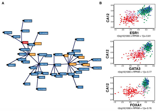 Gene correlation analysis in the same TCGA breast tumor dataset (754 tumors) using MiSTIC revealed a cluster of genes with highly correlated expression biased for luminal tumors (Figure 2A). The strong correlation of cluster genes is not the result of a copy number variation (CNV) event, as most genes are located on different chromosomes. This cluster includes six luminal transcription factor genes: ESR1, FOXA1, GATA3, AR, SPDEF and XBP1 (in orange, Figure 2A), suggesting that clustering reflects transcriptional regulation. Apart from genes located proximal to and likely co-regulated with ESR1 (CCDC170, C6orf211/ARMT1 and RMND1), known estrogen targets are also found in this cluster, including TFF1, AGR3 and CA12 (in red, Figure 2A). CA12 encodes a carbonic anhydrase whose expression is regulated by estrogens in MCF-7 and T-47D breast cancer cell lines [46]. Interestingly, ESR1 expression levels were more highly correlated with those of CA12 (Pearson correlation coefficient of 0.81) than of PGR, TFF1 and GREB1. CA12 expression was also correlated, albeit to a slightly lower level, with luminal transcription factors GATA3 and FOXA1 (correlation coefficients of 0.77 and 0.76, respectively) (Figure 2B).