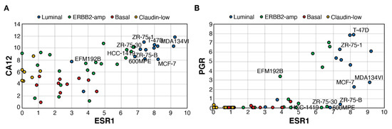 ESR1high cell lines express high levels of CA12, but variable levels of PGR. Pair-wise scatterplots for the expression of ESR1 vs those of CA12 (A) or PGR (B). Values are Log2(Rpkm+1). RNA levels and cell line subtyping are from [61]. Selected cell lines are labeled.