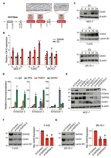 ERα and GATA3 positively regulate CA12 expression in luminal breast cancer cell lines. (A) Schematic CA12 gene organization with exons (grey boxes) and putative enhancers (red boxes). Predicted binding motifs for ERα and GATA3 are highlighted in bold in sequences for enhancers 1 and 2. (B) MCF-7, T-47D and ZR-75-1 cell lines were cultured in hormone-depleted medium for five days and then treated with E2 (25 nM). CA12 mRNA levels were measured by RT-qPCR at 4, 8 and 16 h. RPLP0 and YWHAZ were used as housekeeping genes for normalization. Values are presented as ratios over the expression in vehicle-treated samples for each time point. Asterisks indicate statistically significant regulations (Average of n = 3; *, p ≤ 0.05; **, p ≤ 0.01; ****, p ≤ 0.0001; Student’s unpaired t-test). (C) CAXII protein levels from MCF-7, T-47D and ZR-75-1 cells were analyzed at 0, 4, 8, 16 and 24 h after treatment with E2 by Western blotting (n = 3, a representative blot is shown). β-actin or Lamin B1 housekeeping proteins were used as loading controls. (D) MCF-7 cells were cultured in hormone-depleted medium for three days and then treated with E2 (25 nM) for 1 h before fixation and collection. Binding of ERα, FOXA1 and GATA3 to CA12 enhancers was examined by ChIP-qPCR. Relative immunoprecipitation levels (ratios to IgG in vehicle-treated cells) are shown. The assay was performed twice with similar results. Asterisks indicate statistically significant binding compared to IgG in vehicle-treated cells for each enhancer from one experiment performed in triplicates (*, p ≤ 0.05; one-way ANOVA test, Dunnett’s multiple comparisons test). (E) MCF-7 cells were cultured in hormone-depleted medium for three days and transfected with a SMARTpool of siRNAs targeting CA12 and two different siRNAs targeting ESR1, FOXA1 or GATA3. Cells were then collected two days after transfection. Protein levels of CAXII, ERα, FOXA1 and GATA3 were analyzed by Western blotting (n = 2). β-actin was used as a loading control. (F,G) T-47D and ZR-75-1 cells were cultured in hormone-depleted medium for three days and transfected with two different siRNAs targeting GATA3. Cells were then collected two days after transfection. Protein levels of CAXII and GATA3 were analyzed by Western blotting in T-47D (F) and ZR-75-1 (G) cells; CAXII levels were quantified for both cell lines using ImageJ (average of n = 3 for quantification, one representative blot shown; *, p ≤ 0.05; **, p ≤ 0.01; Student’s unpaired t-test). Lamin B1 was used as a loading control.
