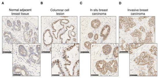 CA12 is expressed physiologically in epithelial cells in the pancreas, kidney and colon as well as in the mammary gland [48,67,68]. We probed CAXII levels in breast tumors as well as in normal tissue by immunohistochemistry (IHC). Different controls were used to validate and optimize CAXII staining of tissue sections, including the pancreas, kidney and colon as positive expression controls and lymph node, liver and spleen for negative controls (Supplementary Figure S5). CAXII levels are higher in breast ductal carcinoma in situ compared to normal lobules and ducts [51]. In pulmonary adenocarcinomas, increased CAXII levels correlate with tumor grade and aggressiveness [69]. Accordingly, in normal mammary gland and normal tumor-adjacent mammary tissues, CAXII levels, detected by IHC using the same antibody as above, were low and heterogeneous (Figure 5A), similar to those of ERα. Conversely, in breast tumors, CAXII levels were high and homogeneous. The osmotic exchange of bicarbonates by CAXII occurs at the basolateral level and not in the lumen in renal and pancreatic epithelial cells [67,68]. CAXII basolateral polarity was observable in columnar cell lesions, in which bilayer integrity is preserved (Figure 5B) but was lost in intra-ductal proliferating cells in ductal carcinoma in situ (DCIS) (Figure 5C) and in cells migrating into the stromal compartment in invasive ductal carcinoma (IDC) (Figure 5D).