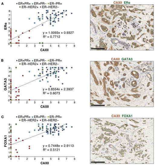 Immunohistochemistry analysis of ERα, GATA3, FOXA1 and CAXII was then carried out in consecutive slices of seven tissue micro-arrays (TMAs) displaying 118 tumors represented in triplicates. Scores for nuclear (for ERα, GATA3 and FOXA1) or membrane (for CAXII) staining in individual tumors were computed using QuPath [54] after training for identification of epithelial, stromal and immune compartments and validation by a pathologist (Figure S6A,B). Cut-offs for positivity were set at 4 for ERα and at 3 for CAXII, based on their bimodal distributions (Figure S7A,B). QuPath scores for ERα were largely concordant with the ER clinical status. Linear regression analysis of score distributions for CAXII and ERα, GATA3 or FOXA1 revealed a high determination coefficient (R2 ~0.77, ~0.61 and ~0.51, resp., Figure 6A–C), supporting at the protein level the correlations observed at the RNA level between CA12 and ESR1, GATA3 or FOXA1 expression. Accordingly, co-staining of CAXII (membrane localization, brown) and ERα, GATA3 or FOXA1 (nuclear localization, green) in tumors further supported their co-expression (Figure 6A–C).