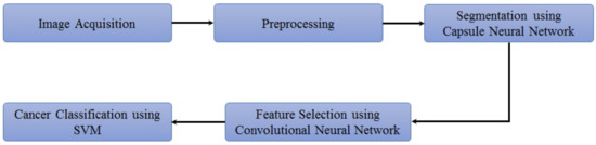 The proposed methodology is depicted in Figure 2. The lung nodule image dataset is obtained and preprocessed initially. Then, lung segmentation is conducted by capsule network [11]. Capsule segmentations demonstrate state-of-the-art results as compared to other techniques such as U-net [12] and image processing techniques. After lung segmentation, the region of interest (ROI) is selected using the information provided in the LUNA16 dataset. Then on that ROI, the proposed hybrid technique is applied for the classification of cancerous and non-cancerous cells. The architecture of the proposed approach is shown in Figure 3. The acquired images are preprocessed and segmented to extract the region of interest (ROI). Next, a hybrid technique is applied for the classification of cancerous and non-cancerous cells. Acronyms used in this study can be found in Table S1.