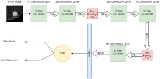 A 64 × 64 image is given to the convolutional layer. The network consists of 5 convolutional layers in total. The first two convolutional layers have 32 filters with 3 × 3 kernel. The next convolutional layer has 2 × 2 max pooling, then more two-convolution layers are placed with 32 filters and 3 × 3 kernel. Again, the max-pooling 2 × 2 is applied and then in the 5th convolutional layer, 64 filters with 3 × 3 kernel are present. Finally, the output of the 5th convolutional layer is flattened in a one-dimensional array. In that 1D vector, features are extracted. These features are then input to the machine learning model SVM for classification. Figure 4 shows the hybrid model, in which CNN extracts the features from the image and SVM is used for classification.