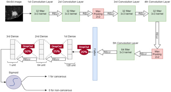 In CNN, a 64 × 64 image is given to the convolutional layer. There are 5 convolutional layers and 2 max-pooling layers, stacked in the network. The first convolutional layer has 32 filters with 3 × 3 kernel and a stride of 1. The second convolutional layer also has 32 filters with 3 × 3 kernel and a stride of 1. After these convolutional layers, a 2 × 2 max pooling is applied for feature selection. Later, two convolution layers are placed with 32 filters and 3 × 3 kernel and again max-pooling 2 × 2 is applied. Then, in the 5th convolutional layer, the 64 filter exists with 3 × 3 kernel. After that, the output of the 5th convolutional layer is flattened in a 1-dimensional vector. Three dense connected layers exist after flattening to avoid overfitting. Dropouts of 20%, 25%, and 50% are used before each dense layer, respectively. After each convolutional layer, sigmoid activation functions are used. The proposed CNN for classification is shown in Figure 5.