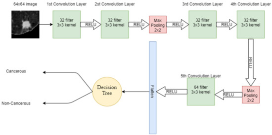 RF is an ensemble learning algorithm where many weak classifiers are combined to obtain a strong classifier. In RF, many DTs are trained on the data and each DT acts as one predictor to produce the output class. The class with a majority vote then becomes the final prediction of RF. The hybrid model combining CNN and RF is shown in Figure 9.