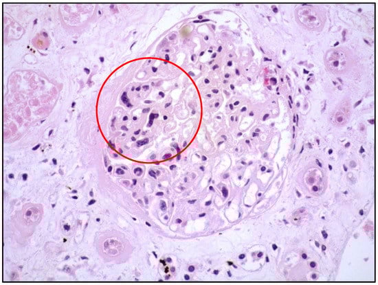 High-power view showing kidney parenchyma with large, atypical cells growing within vascular spaces (see within red circle; hematoxylin and eosin, 200× magnification, previously unpublished, original image from S.A.).