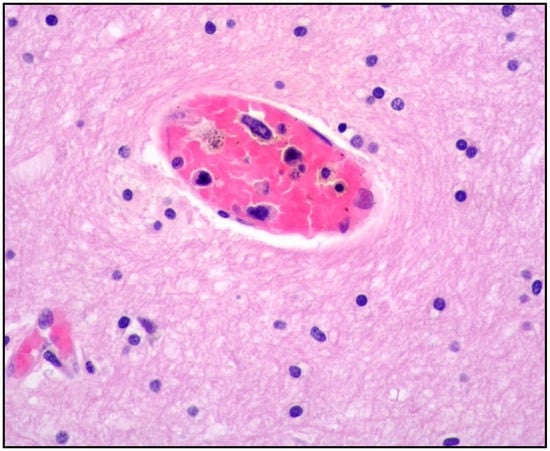 High-power view showing central nervous system parenchyma with atypical cells within a vascular space (hematoxylin and eosin, 400× magnification, previously unpublished, original image from S.A.).