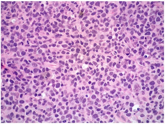 High-power view showing a diffuse and polymorphic proliferation of atypical, medium- to large-sized lymphoid cells (hematoxylin and eosin, 200× magnification, previously unpublished, original image from S.A.).