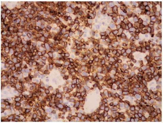 High-power view showing a diffuse proliferation of CD56-positive atypical cells (CD56 immunostaining, 200× magnification, previously unpublished, original image from S.A.).