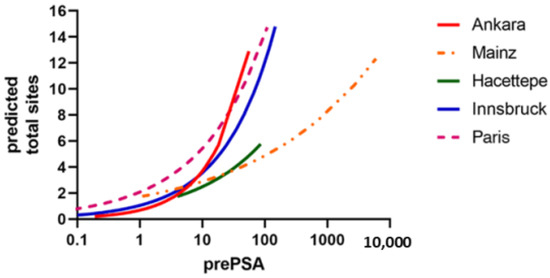 The five cohorts had grossly similar relation between the prescan PSA and the number of positive sites on the restaging PSMA PET/CT. The cohorts are named by the cities for the study centers.