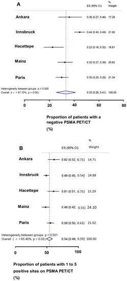 The meta-analysis includes five cohorts with 1216 patients with PSA-only recurrence, as shown in Figure 1. Clinical characteristics are summarized in Table 1. The management of the patients differed slightly between the centers. The Hacettepe center [6] gave ADT to 48 (50%) of 96 patients as part of the initial treatment. Four centers restaged all patients with PSMA PET/CT, whereas the Paris center [10] carried out the initial restaging with [18F]-fluorocholine or [18F]-fluciclovine PET/CT and used PSMA PET/CT as a secondary restaging of only the [18F]-PET-negative patients.