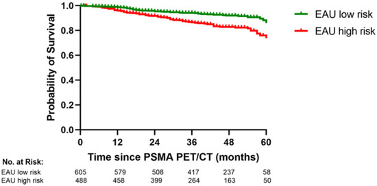 The EAU BCR risk classification separated our patients into BCR low- and high-risk groups that differed significantly in OS, as shown Figure 5 (p = 0.0001, log rank test). However, our PSA/PSMA PET risk model predicted OS better than the EAU BCR risk classification and had a higher c-index (0.77 vs. 0.68). The prediction of OS in the PSA/PSMA PET/CT risk model did not improve significantly by adding the EAU BCR risk score (p = 0.64).