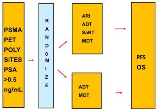 The Advanced Prostate Cancer Consensus Conference (APCCC) experts reported concerns of “under- and overtreatment of patients following restaging with PSMA PET/CT”. The literature indicates that a negative restaging PSMA PET/CT should be considered as false-negative and definitively not as evidence for absence of PCa and need of treatment. PSMA PET/CT most often do not detect lesions with a diameter < 0.5 cm. However, the aggressive salvage treatment of our patients with polysites PCa was relevant and not overtreatment. Ongoing randomized trials evaluate treatments after a restaging PSMA PET/CT. In addition, randomized phase III trials may point out the best treatment of patients with polysites PCa, as indicated in Figure 6.